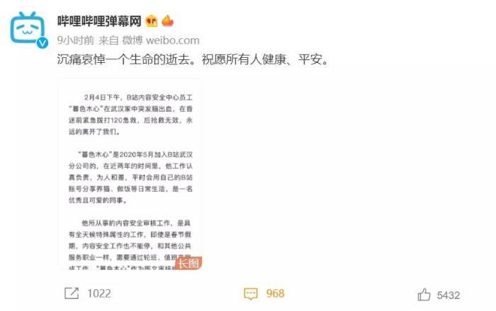 2月7日,微博认证为职场博主的用户“王落北”称,据多名网友爆料,B站武汉AI审核组组长过年期间值班,在晚上9点到早上9点(12小时)的工作强度下,2月5日凌晨脑出血猝死。