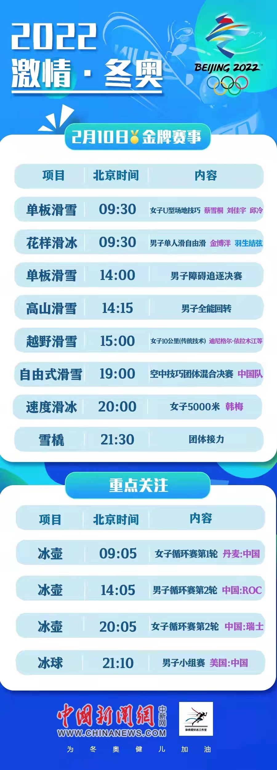 中新网2月10日电 在10日冬奥赛场的8金争夺战中,中国军团有望在单板滑雪和自由式滑雪赛场有所斩获。花样滑冰男单自由滑的“神仙打架”,以及女子冰壶拉开战幕和男子冰球的全面展开,为当日赛事带来更多看点。