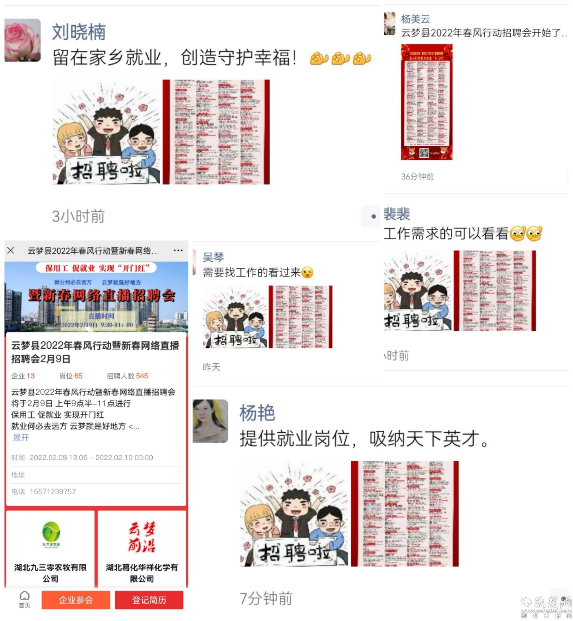 荆楚网(湖北日报网)讯(通讯员徐清、王晶)2月9日,为促进城乡劳动者在家就业,保障企业用工需求,云梦县吴铺镇线上线下全面开展2022年“春风行动”,为近百家企业,数千名群众搭建双向互选桥梁。