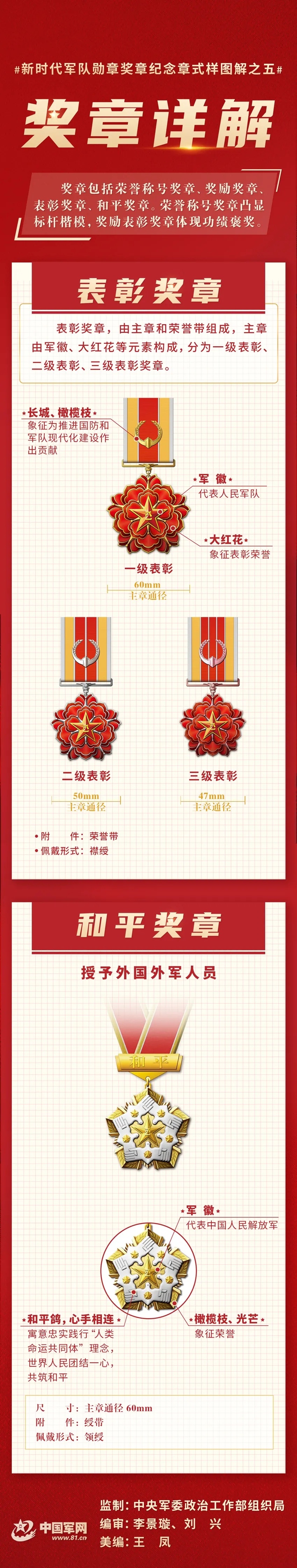 “和平勋章”由和平鸽、橄榄枝、地球等元素构成,授予外国外军人员。