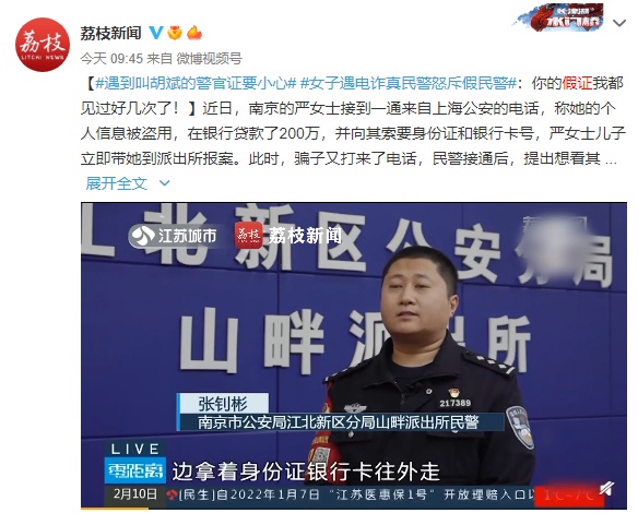 近日,南京的严女士接到一通来自上海公安的电话,称她的个人信息被盗用,在银行贷款了200万,并向其索要身份证和银行卡号,严女士儿子立即带她到派出所报案。此时,骗子又打来了电话,民警接通后,提出想看其警官证的背面,对方恼羞成怒挂断电话。民警表示,他见过的所有诈骗都使用这张叫做“胡斌”的假证,这个假证他已经见过很多次了。