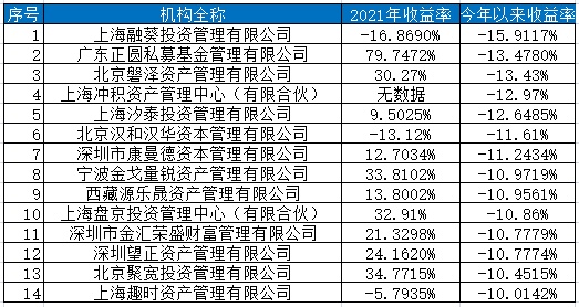 而根据朝阳永续基金研究平台提供的数据,上海融葵投资管理有限公司、广东正圆私募基金管理有限公司、北京磐泽资产管理有限公司、上海冲积资产管理中心(有限合伙)、上海汐泰投资管理有限公司、北京汉和汉华资本管理有限公司、深圳市康曼德资本管理有限公司、宁波金戈量锐资产管理有限公司、西藏源乐晟资产管理有限公司、上海盘京投资管理中心(有限合伙)、深圳市金汇荣盛财富管理有限公司、深圳望正资产管理有限公司、北京聚宽投资管理有限公司、上海趣时资产管理有限公司14家百亿级私募基金公司年内跌幅均超过10%,垫底百亿私募年内业绩榜,其中不乏知名私募巨头,比如源乐晟。