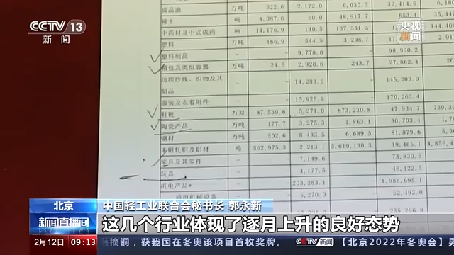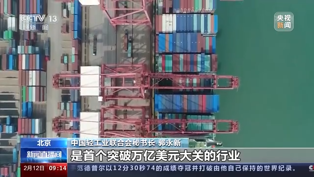 中国轻工联合会秘书长 郭永新:这是12月份的全国出口重点商品,这是11月份的,体现了一个逐月上升的良好态势。我们判断今年轻工业的出口将突破10000亿美元的大关,是首个突破万亿美元大关的一个行业。
