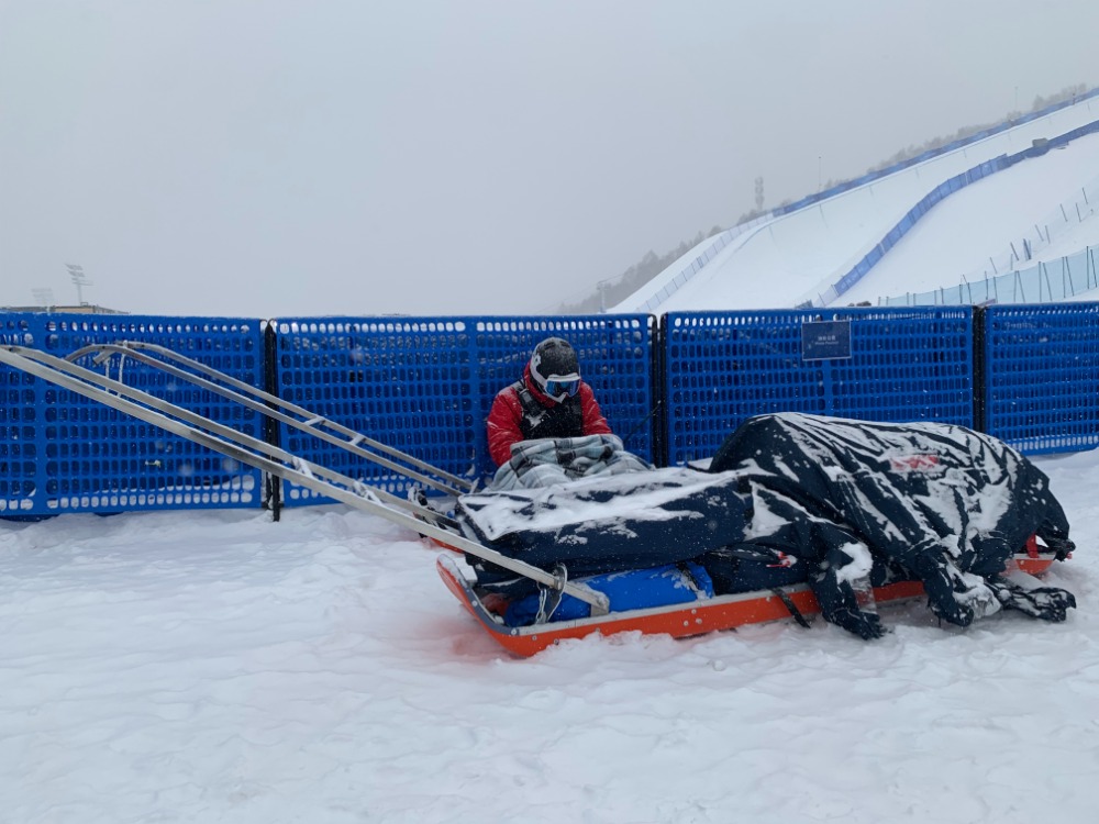 云顶滑雪公园的比赛因为天气推迟,医疗救护人员仍在现场守护。