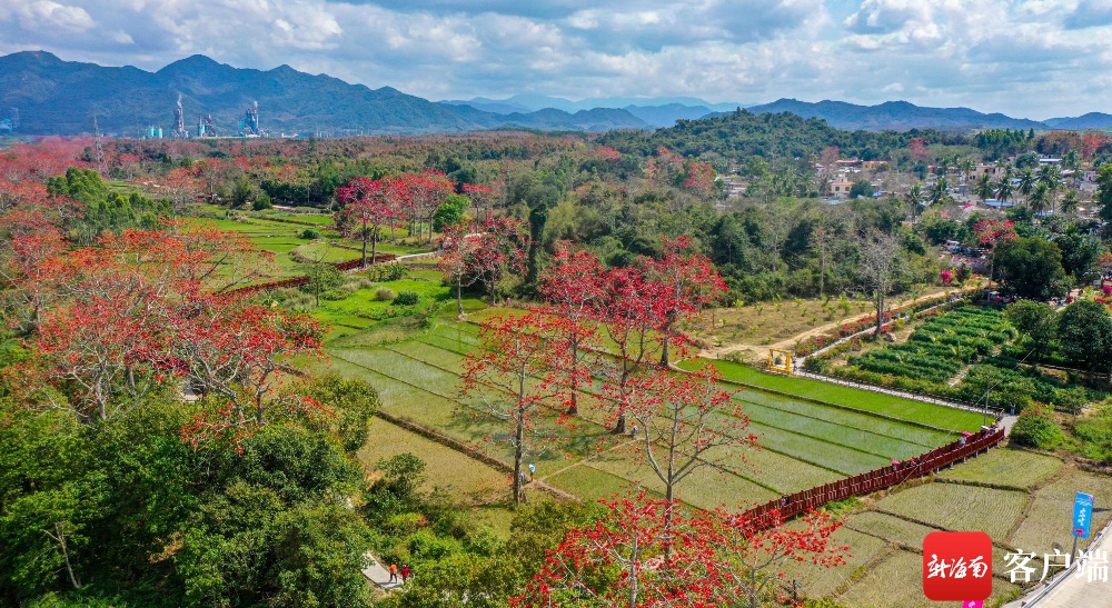 朵朵红花点缀着绿色田野,呈现“万绿丛中一点红”的美景;有的花儿倒映在水面,随着微风摇曳……到昌江赏木棉红,七叉镇昌化江畔木棉红观景区和宝山村梯田是绝佳景点之一。