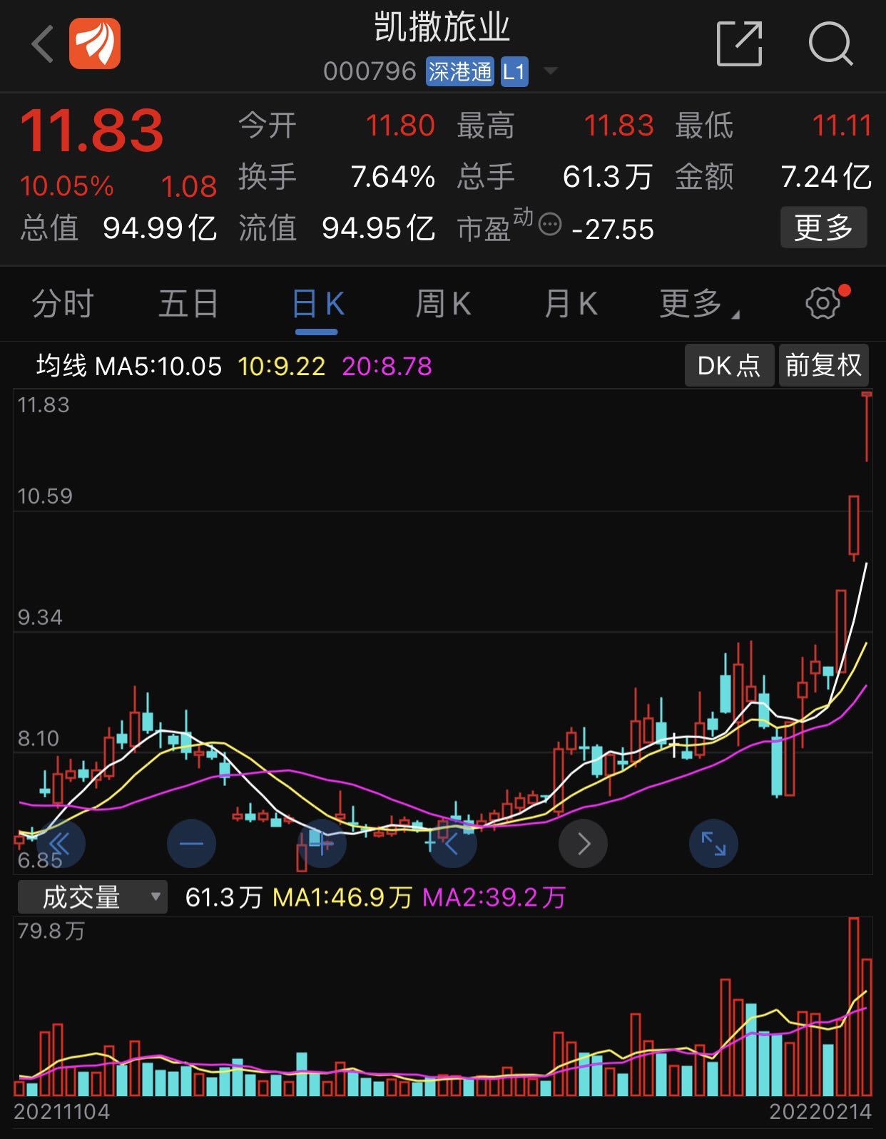 海南股凯撒旅业已收获三连板。2月13日晚间,该公司发布股票交易异常波动公告称,当前国内游市场受多地疫情反复影响,出境游市场尚待开启,但随着新冠疫苗普及接种和特效药的顺利推出,2022年旅游市场有望迎来更多积极变化,公司正在逐步准备迎接后疫情时代下的行业变革和市场机会。此外,公司航空、铁路配餐业务已陆续恢复,公司亦在积极探索目的地、新零售等创新业务,以进一步增强盈利能力。