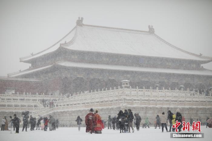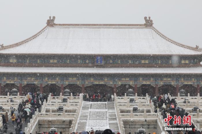 2月13日,北京迎来农历壬寅虎年首场降雪,民众在雪中游览故宫。 中新社记者 盛佳鹏 摄