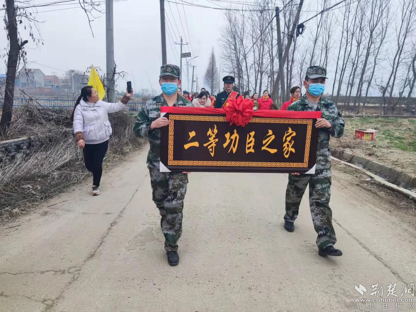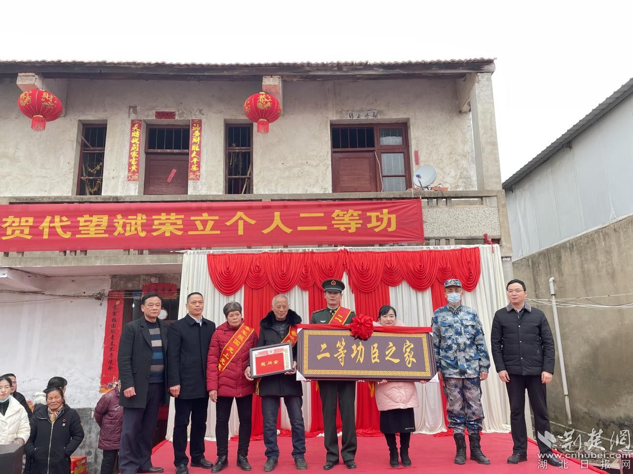 荆楚网(湖北日报网)讯(通讯员江来、曹向阳、邓鹏)2月15日上午,在云梦县下辛店镇邱湖村代望斌家中,云梦县委常委人武部政委李国强、下辛店镇党委镇政府、县退役军人事务局相关单位负责人为代望斌和军属送上了“二等功之家”牌匾和“二等功”喜报等。