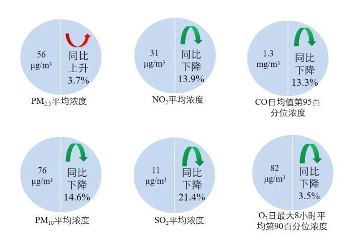 1月,全国339个地级及以上城市平均空气质量优良天数比例为73.4%,同比下降1.2个百分点;PM2.5平均浓度为56微克/立方米,同比上升3.7%;PM10平均浓度为76微克/立方米,同比下降14.6%;O3平均浓度为82微克/立方米,同比下降3.5%;SO2平均浓度为11微克/立方米,同比下降21.4%;NO2平均浓度为31微克/立方米,同比下降13.9%;CO平均浓度为1.3毫克/立方米,同比下降13.3%。
