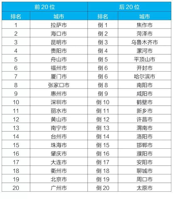 1月,168个重点城市中,拉萨、海口和昆明市等20个城市空气质量相对较好(从第1名至第20名);焦作、菏泽和乌鲁木齐市等20个城市空气质量相对较差(从倒数第1名至倒数第20名),见附表。