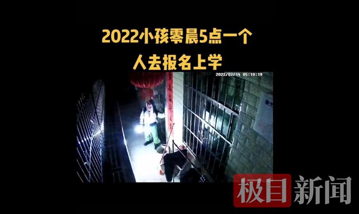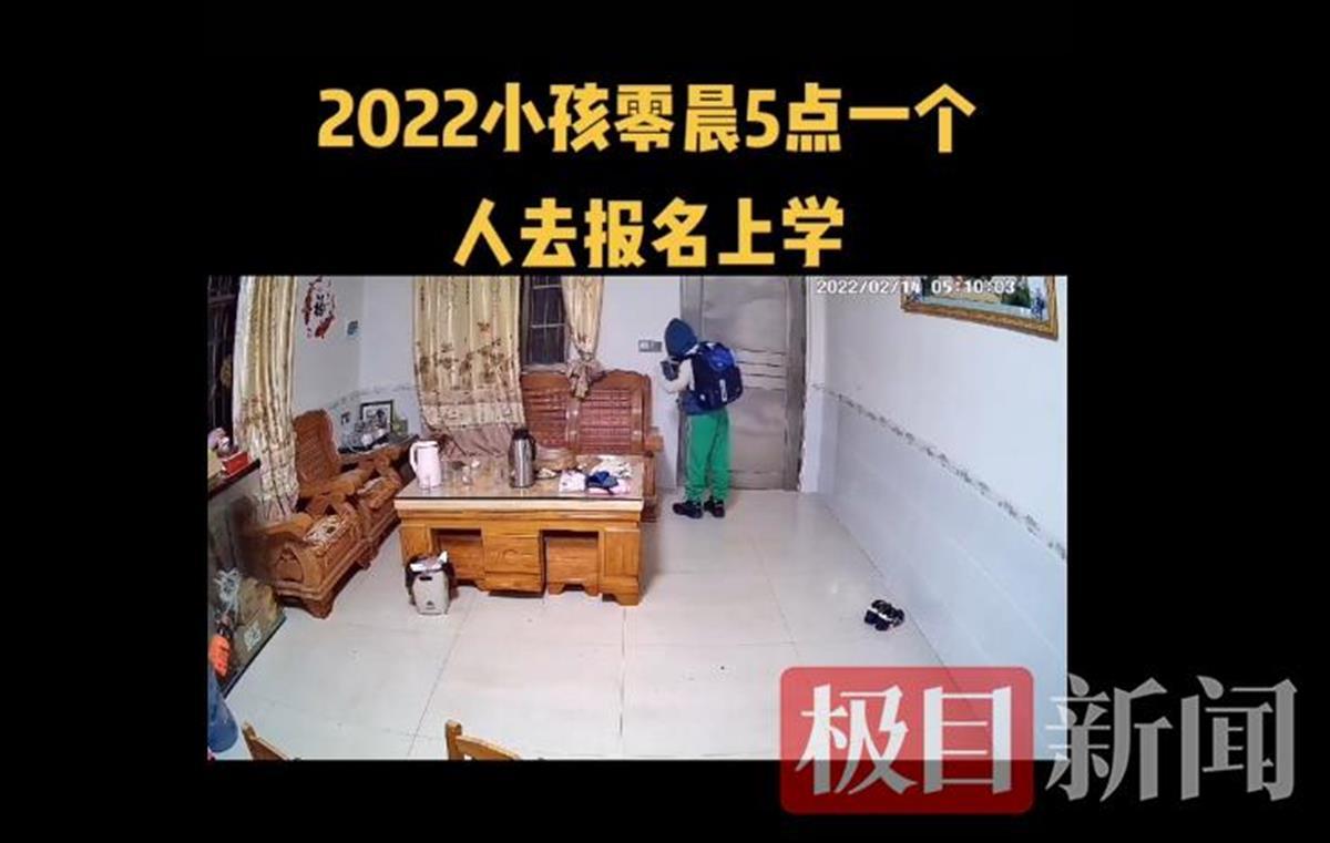 视频发布者称,这是2022年2月14日的凌晨,他的儿子独自一个人从家到学校去报名上学,他在千里之外的深圳通过家中的视频探头记录下这一幕。