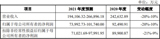 华兰疫苗预计2021年营业收入预计为19.41亿元至26.69亿元,相较2020年度的变动幅度为-20%-10%;归属于母公司所有者的净利润预计为7.40亿元至10.17亿元,相较2020年度的变动幅度为-20%-10%;扣除非经常性损益后归属于母公司所有者的净利润预计为7.10亿元至9.80亿元,相较2020年度的变动幅度为-21%-9%。上述2021年度业绩情况系公司初步预计数据,不构成公司的盈利预测或业绩承诺。
