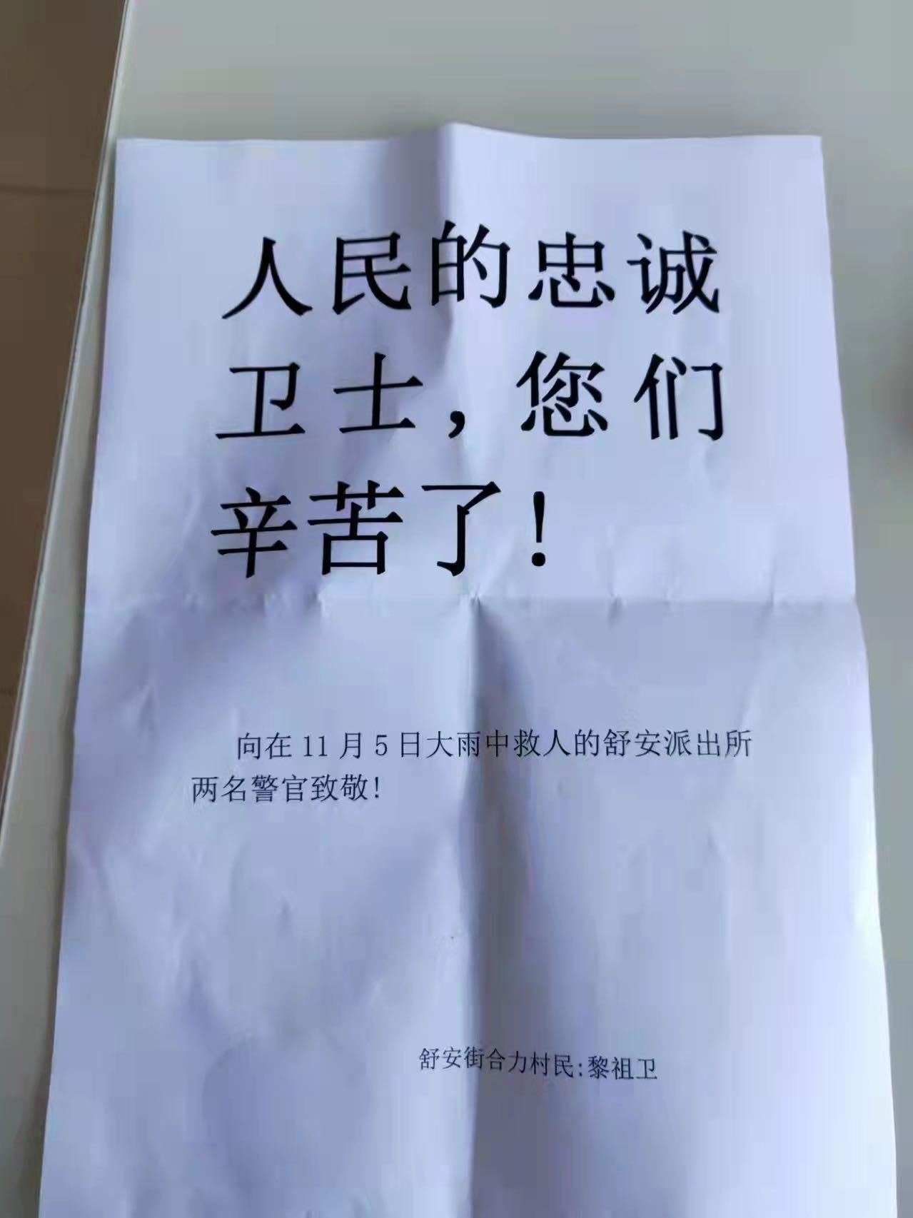 长江日报大武汉客户端2月18日讯(记者徐丹 通讯员李鹏程)2月17日,江夏区舒安派出所收到一位村民送来的一张叠得整整齐齐的白纸,民警打开一看,白纸上面打印着“人民的忠诚卫士,您们辛苦了”,字是舒安街合力村村民黎祖卫找人打印的,以感谢三个月前在大雨中救他的两位民警。