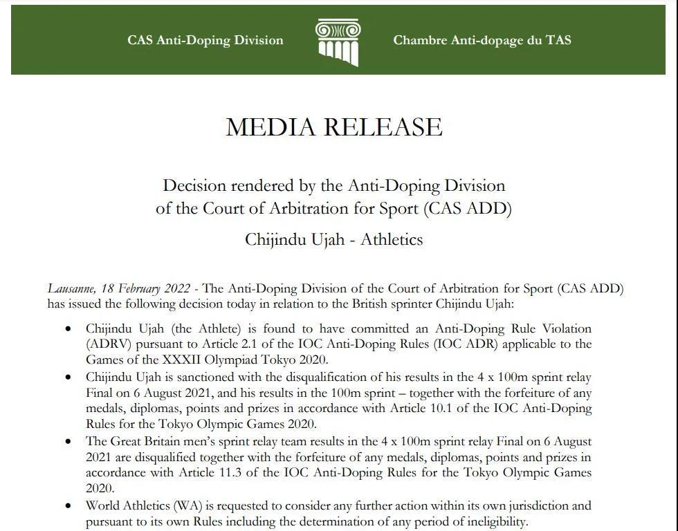 经过约5个月的等待,国际体育仲裁法庭(CAS)终于公布了相关结果。如外界所料,乌贾被认定兴奋剂违规,英国队的成绩也被取消。