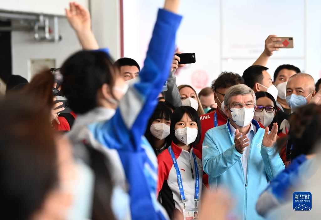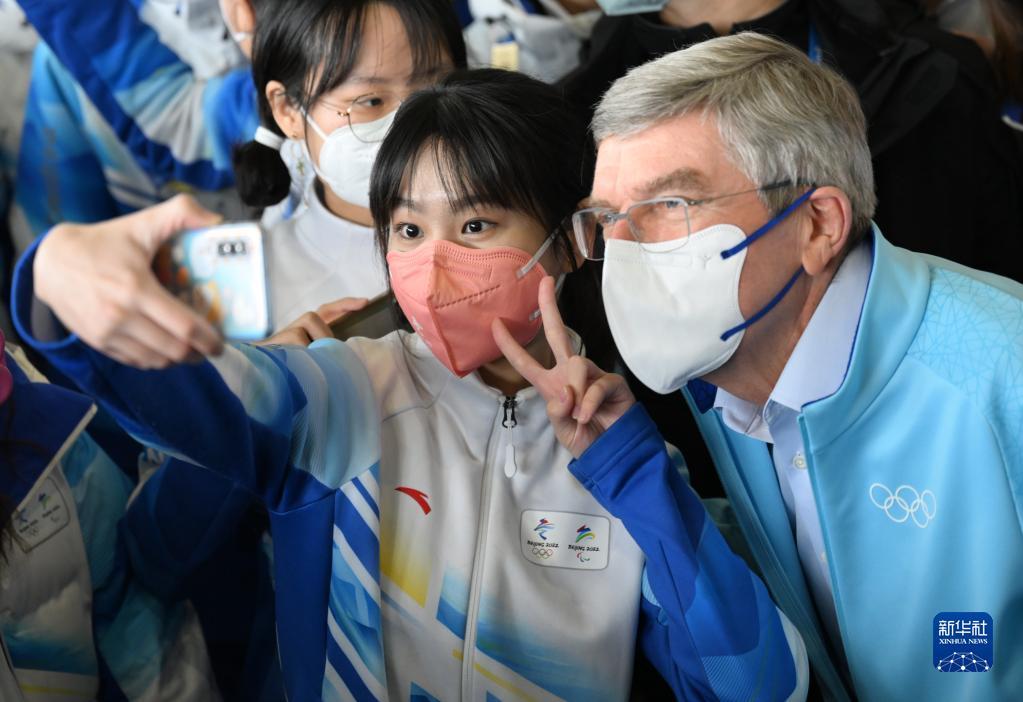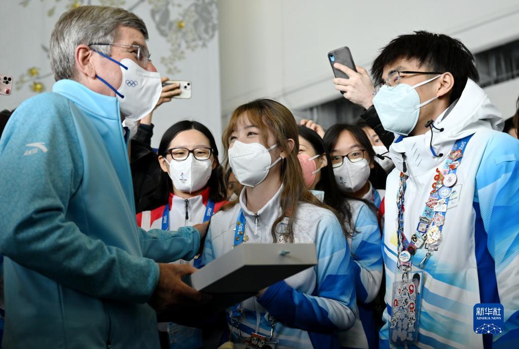 2月18日,国际奥委会主席巴赫来到北京2022年冬奥会主媒体中心,与志愿者交流互动。