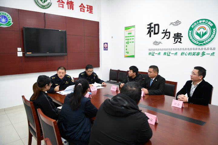 浙江省湖州市吴兴区综合行政执法局龙泉中队在“阳光调解室”进行调解工作(2018年11月14日摄)。新华社记者 黄宗治 摄