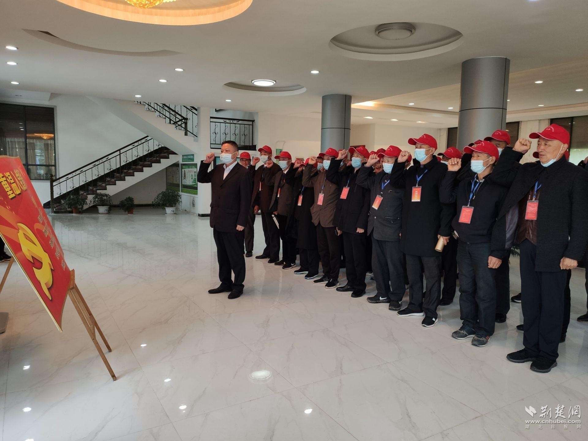 疗养优抚对象在峒山社区省直机关党员干部教育基地重温入党誓词。鄂州市优抚医院供图