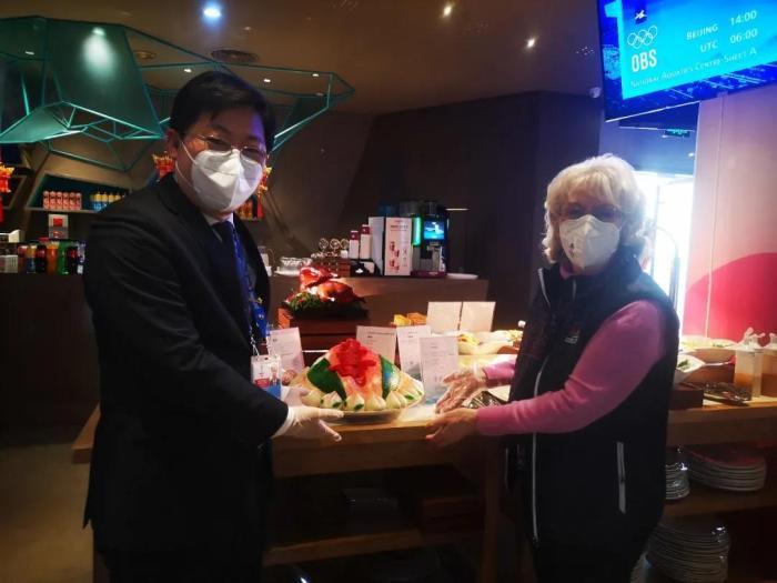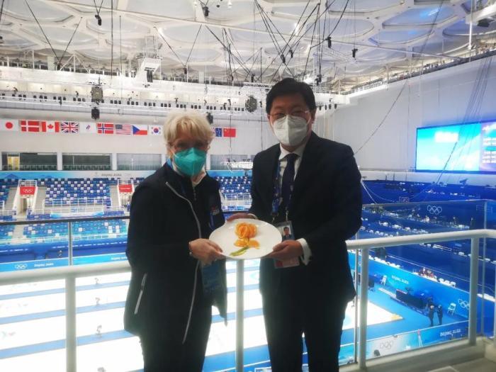 2月17日,世界冰壶联合会主席凯特与休息室寿桃合影。