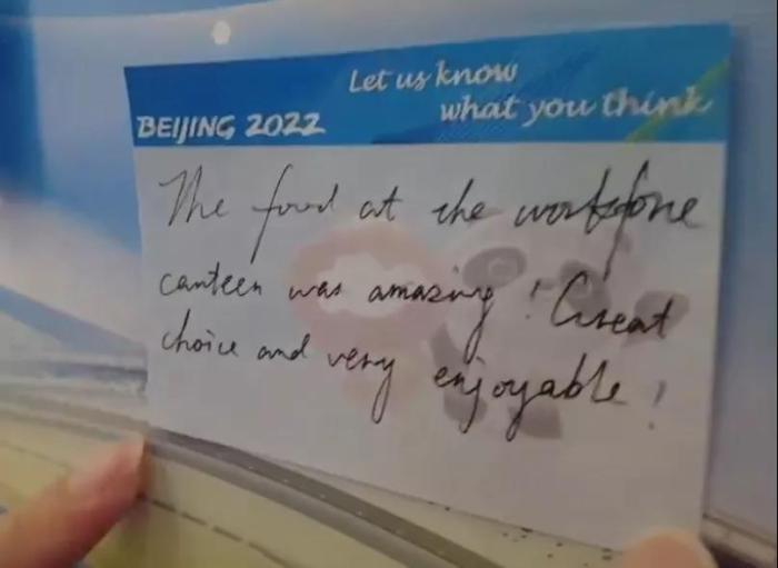 在北京延庆冬奥村运动员餐厅一面墙,贴满了各种“夸夸”留言。大多是对中华美食的喜爱以及对志愿者的感谢,堪称冬奥村里的“表白墙”。