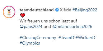 德国冬奥代表团官方账号20日发文写上“Xiè Xiè(谢谢)北京2022”,还表示已经开始期待2024年巴黎奥运会及2026年米兰-科尔蒂纳丹佩佐冬季奥运会了。