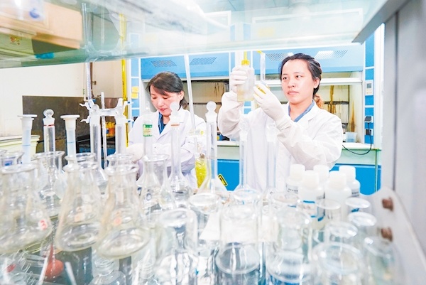 大冶湖高新区,湖北融通高科先进材料有限公司技术人员在实验室里忙碌。 (湖北日报全媒记者 薛婷 摄)