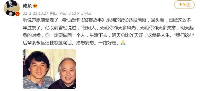 “我们这些后辈会永远记住您这句话。愿您安息。一路好走。”成龙缅怀道。
