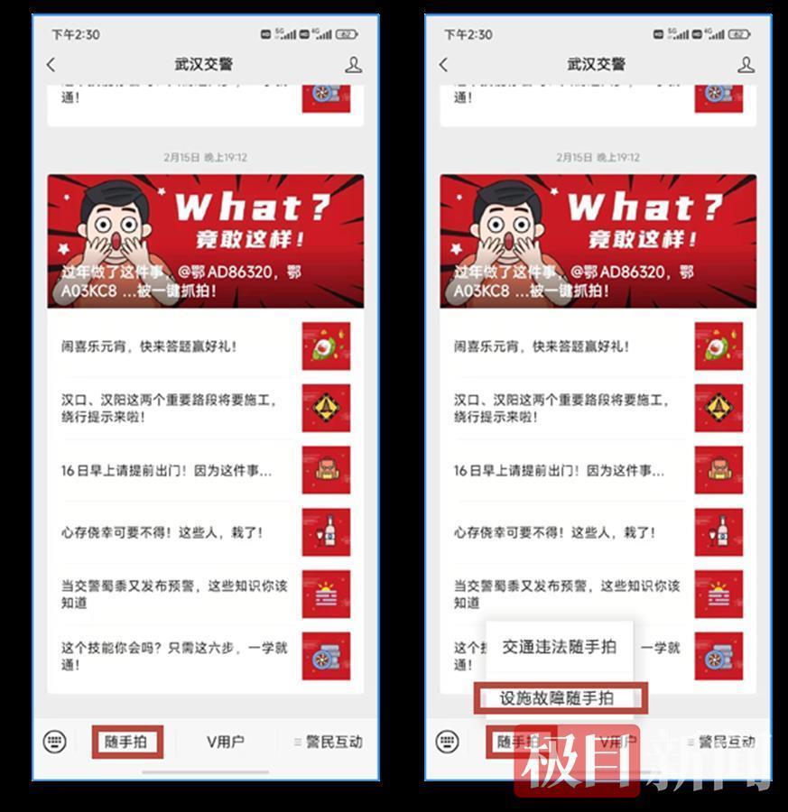 或者在“武汉交警”微信号里,发送文字关键词,如“红绿灯坏了”,就能弹出“交通设施故障随手拍”的小程序。