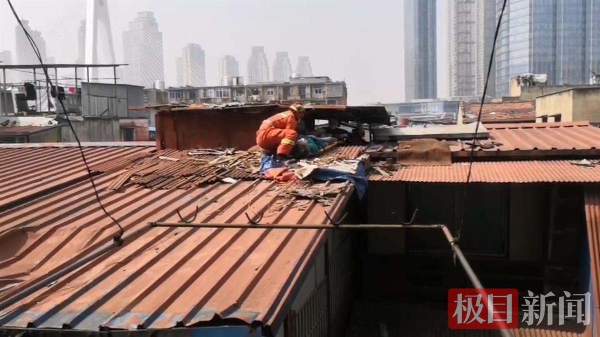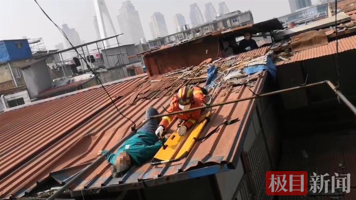 2月24日中午11时56分许,武汉市硚口区兴隆北巷内,一名老人躺在一栋居民楼屋顶彩钢板上痛苦呻吟,附近居民见状立马拨打报警电话求助。武汉市消防救援支队119指挥中心接警后,立即调度硚口区汉正街消防救援站赶赴现场处置。