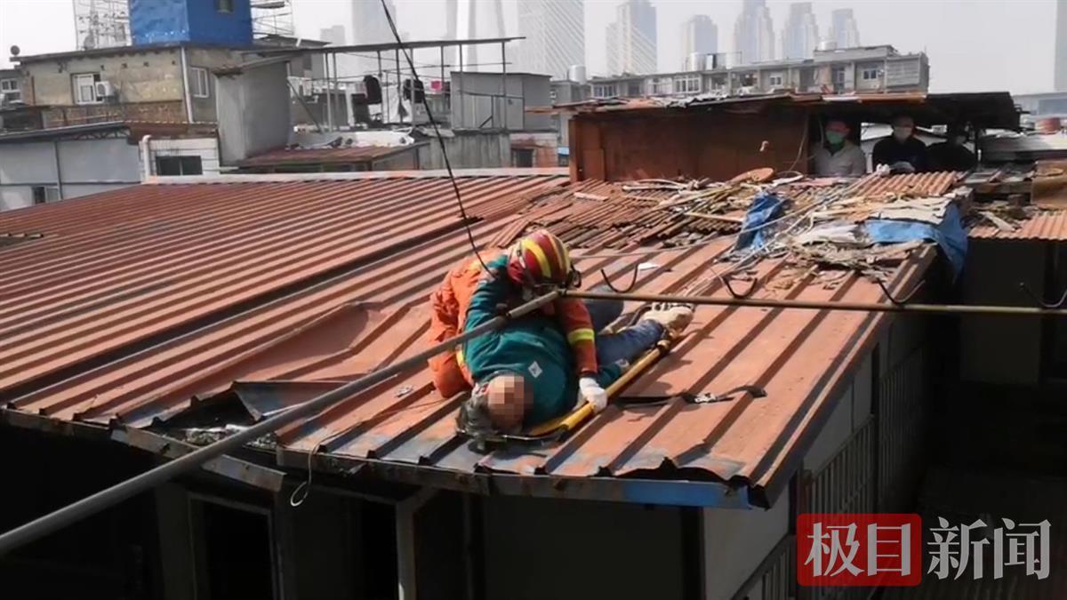 由于屋顶彩钢板十分脆弱,安全起见,消防指挥员指派一名消防员做好防护措施后,携带多功能担架小心翼翼地爬到老人身边,在医护人员指导下,将老人固定在担架上,随后配合楼顶出口处的其他消防员一起将老人拉进楼内,众人再合力把担架抬到楼下。