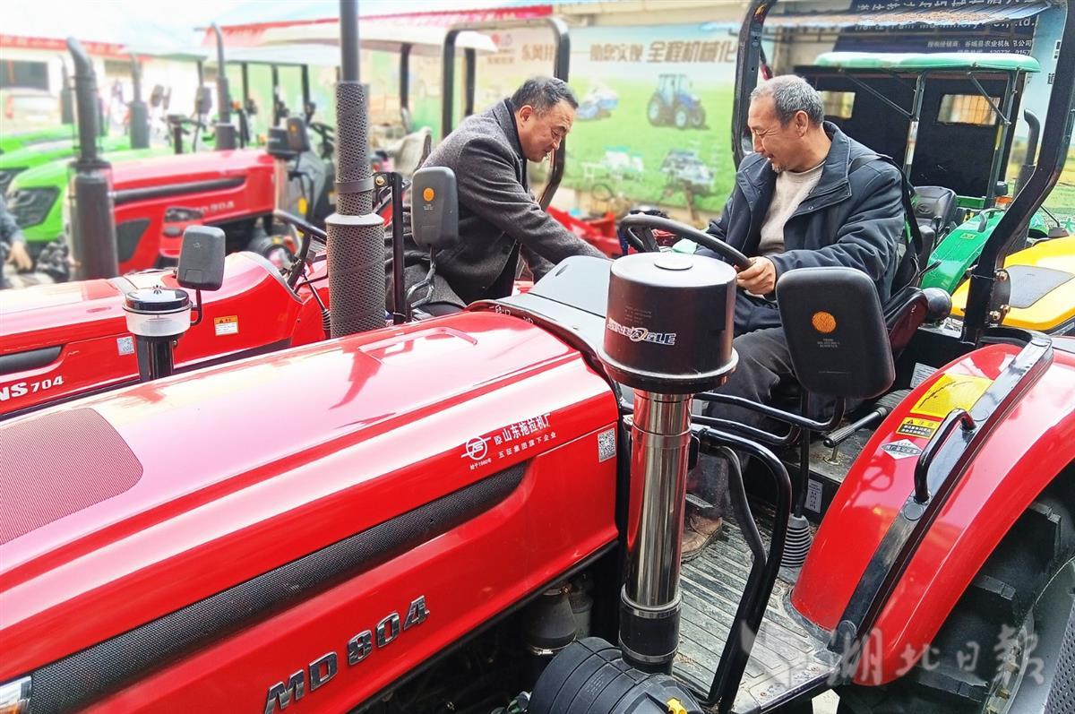 2月24日,谷城县盛康镇种粮大户在县农业机械经营有限公司选购大型轮式拖拉机。近年来,该县加大农机补贴政策宣传力度,着力推广普及农业机械在农业生产中的广泛运用,仅去年,534户种粮大户、农机大户等就享受到国家农机补贴416万多元。据统计,该县机械播种、收获率达到95%以上。(视界网 马明刚 摄)