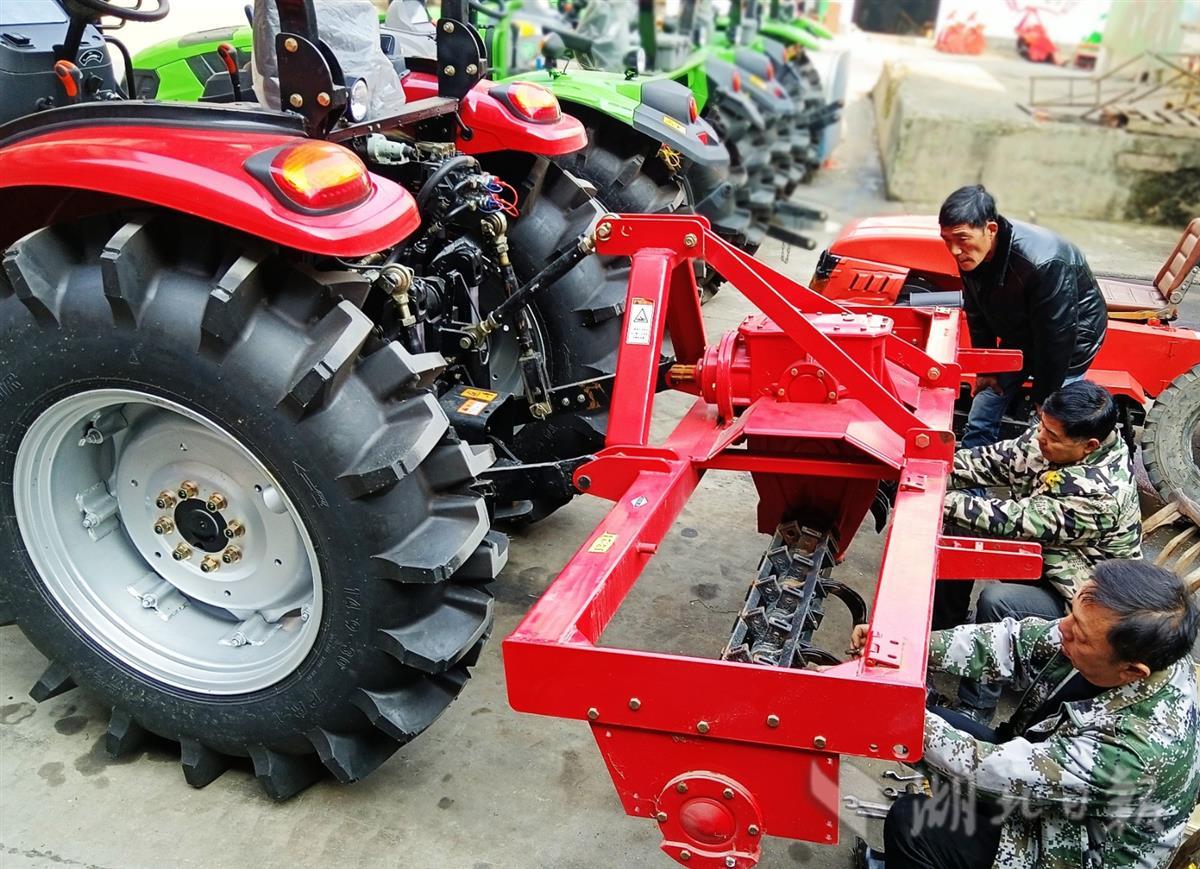 2月24日,谷城县农业机械经营有限公司员工在帮助刚刚购买大型轮式拖拉机的盛康镇种粮大户安装旋耕机。