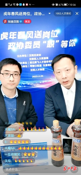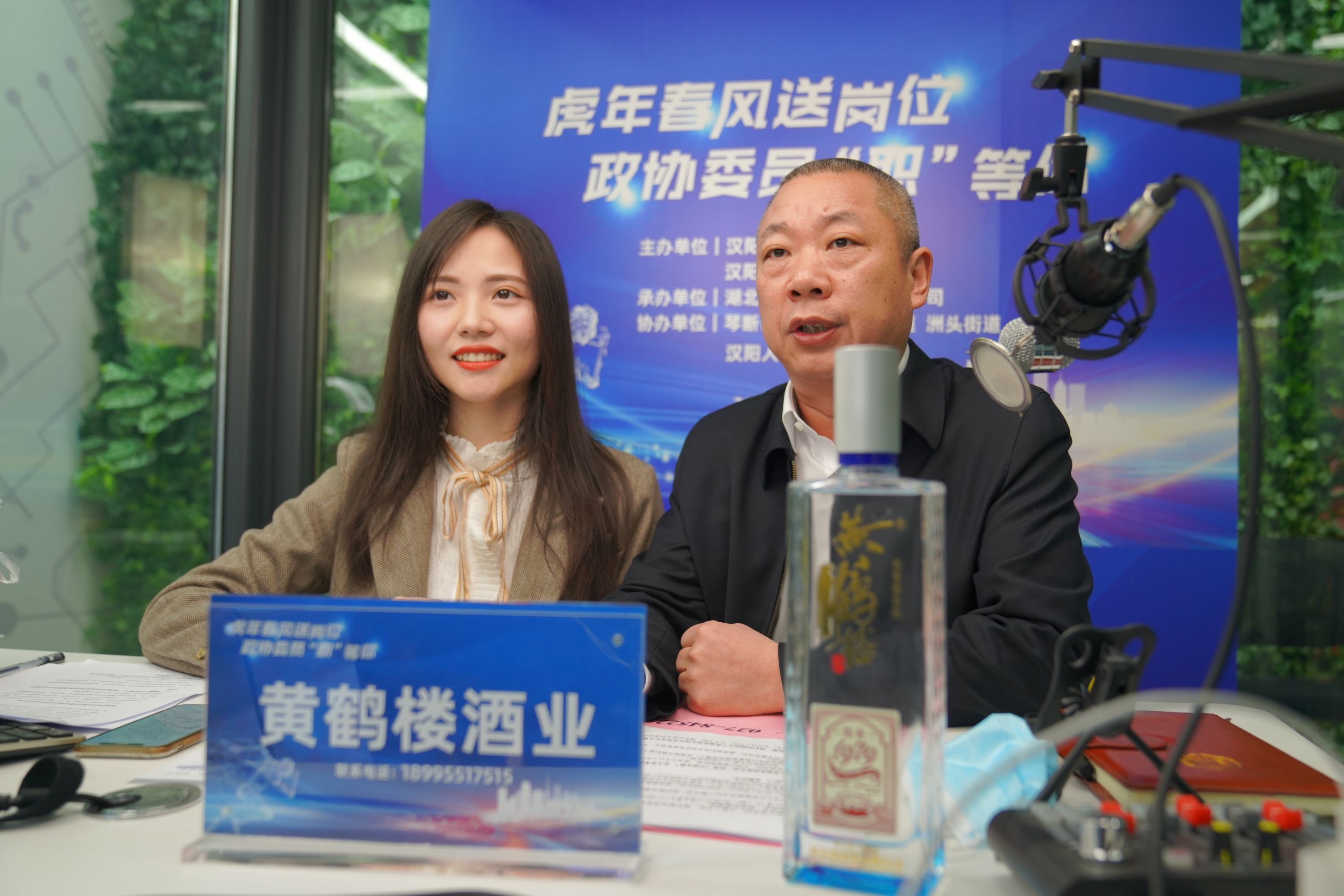 长江日报大武汉客户端2月25日讯(记者万凌 通讯员黄璜 蒋思维) “我是汉阳区政协委员魏国,今天我代表黄鹤楼酒业有限公司来招聘200人,欢迎大家来黄鹤楼酿美酒!”2月25日,在中国武汉人力资源服务产业园(汉阳集聚区),汉阳区政协联合区人力资源局举办“虎年春风送岗位 政协委员‘职’等你”专场招聘会,10名汉阳区政协委员走进直播间进行线上招聘。