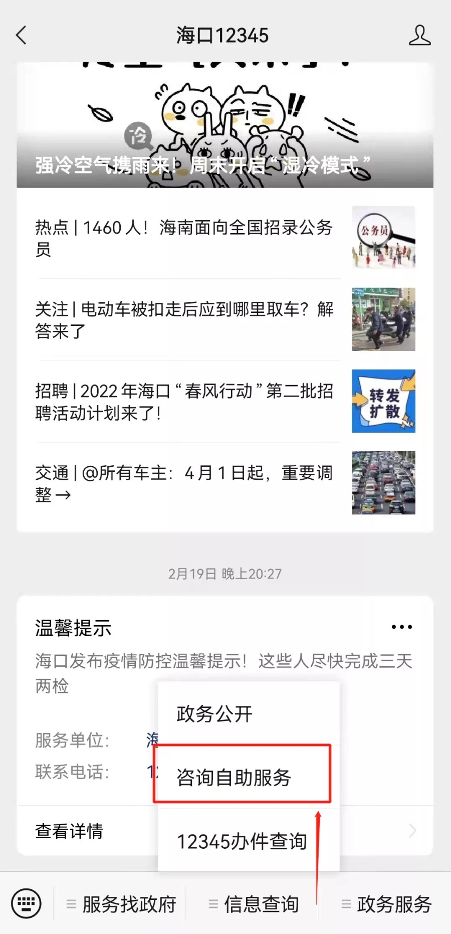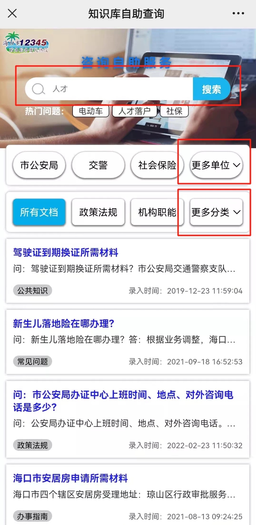 新海南客户端、南海网、南国都市报2月26日消息(记者钟圆圆 通讯员叶素苗)驾驶证到期了如何更换?新生儿落地险在哪里办理?市公安局办证中心的电话是多少?拨打热线要等,跑政务中心太远,今天开始不用再担心,这些问题都可以自助查询了。为及时回应广大市民朋友关切,着力解决群众“急难愁盼”, 提升海口12345热线政务服务水平,提供更高效、便捷的服务,“海口12345”微信公众号上线了知识库“咨询自助服务”功能,提供各类政务信息自主查询服务。