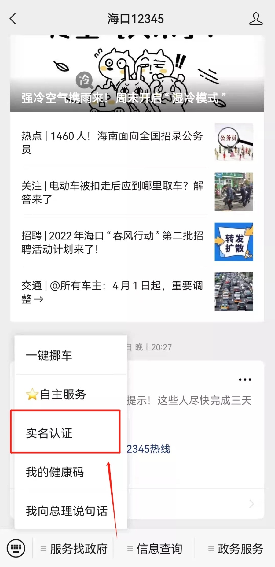 1.关注“海口12345”微信公众号并实名认证