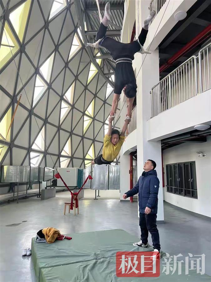 在杂技厅一角,13岁的刘馨琪正与比她大两岁的徐杨倩练空中体操。空中体操也是浠水杂技团传统重点项目之一。