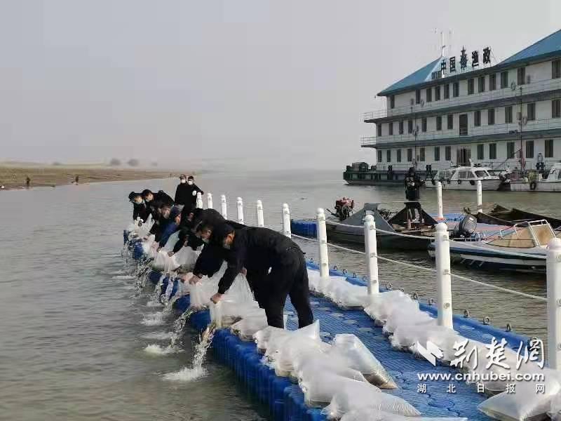 长江武汉渔政码头,12位执法人员代3名违禁在长江捕鱼的被告人将73.76公斤成鱼、13.83万尾鱼苗放还长江。通讯员供图
