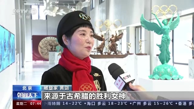 雕塑家 黄剑:我的《奥运女神》是来源于古希腊的胜利女神,古希腊的胜利女神是代表体育和胜利。这个作品的基座就是一朵荷花,荷花在中国文化里面代表和平和美。