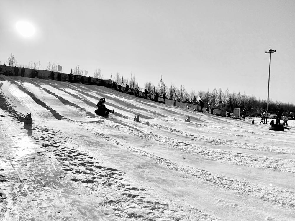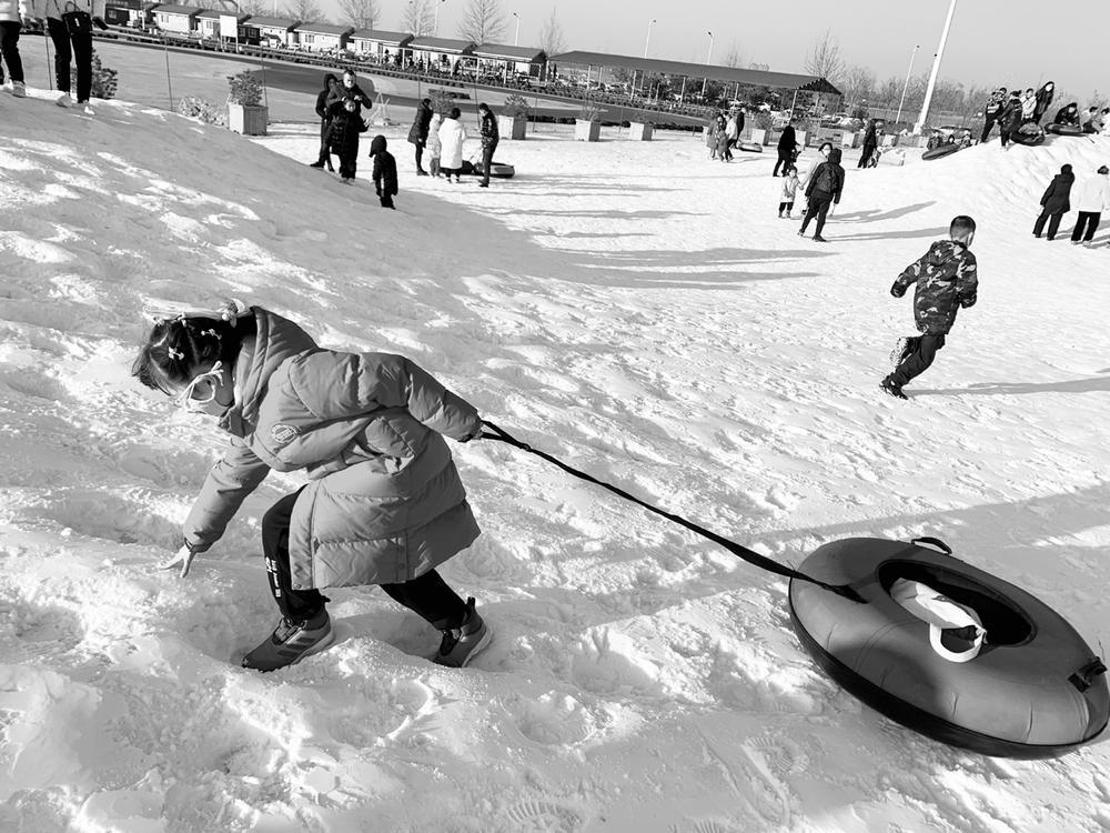 冰雪游乐,乐在其中。图为在滹沱河畔一处冰雪游乐园,孩子们在家长的陪伴下体验滑雪圈等游乐项目。