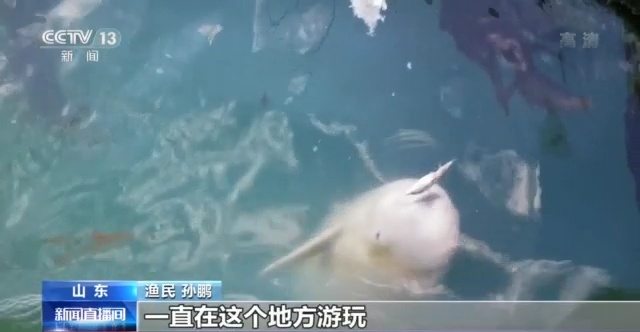渔民 孙鹏:一喂这两鱼也不走了,一直在这个地方游玩,在我们养殖海域附近转悠,在这个地方待了能有七八天了。