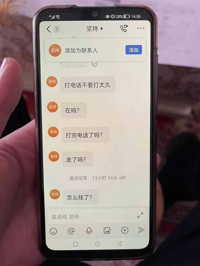 屋内,罗某正一边和人讲着电话,一边在手机上操作着。付明立即抢过了罗某的手机,并挂断了电话。此时手机上显示,罗某已经和对方通话了13小时56分4秒!