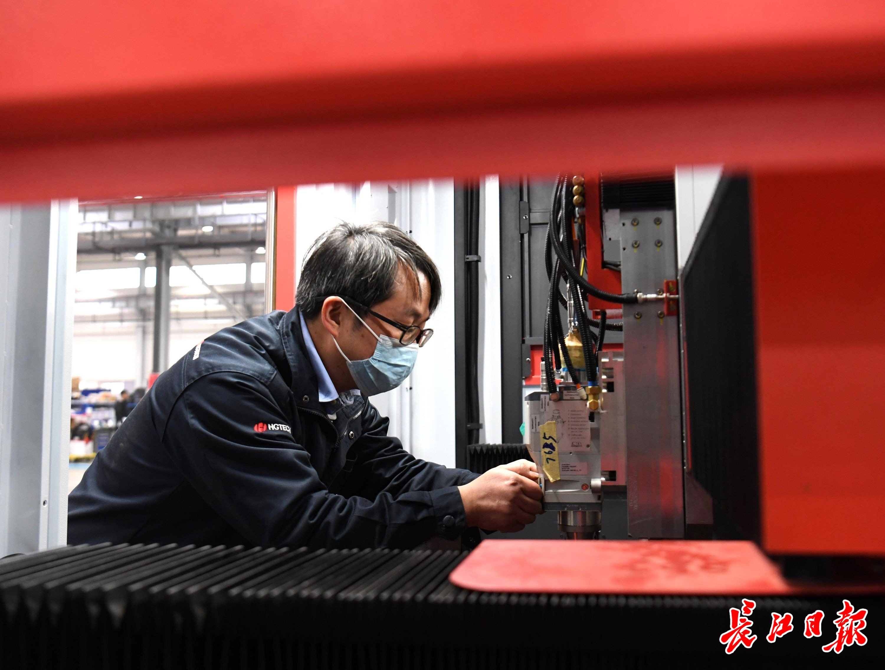 华工科技智能制造产业园流线化智慧工厂生产车间,技术人员在调试大型激光切割装备。长江日报记者高勇 摄(线索提供:通讯员俞智君)