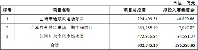 扣除发行费用后,本次发行募集资金将用于曲靖市通泉风电场项目、会泽县金钟风电场一期工程项目和红河州永宁风电场项目,拟投入募集资金金额分别为4.49亿元、4.71亿元和9.46亿元。