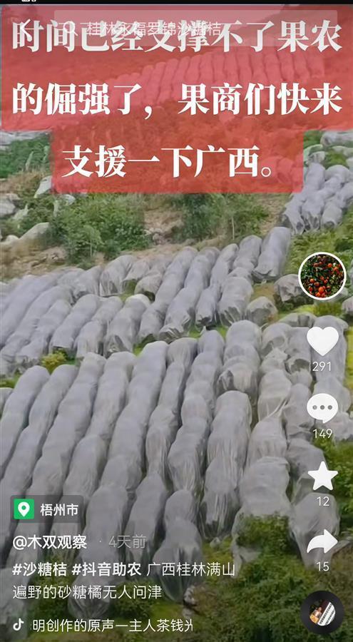 同样发愁的还有来宾市象州县中坪镇的果农陈伟(化名)。2017年,他在同村人的建议下,将多年打工的积蓄投入到砂糖橘产业。坚持了几年后,他有了放弃的打算,“从2020年开始砂糖橘就不太好卖,去年亏了几万块,今年目前还有1万多斤砂糖橘愁销路。”他表示,他身边有果农都直接邀请市民来免费摘果,“反正也卖不动,挂树上让人采还要成本,干脆让大家来摘。”