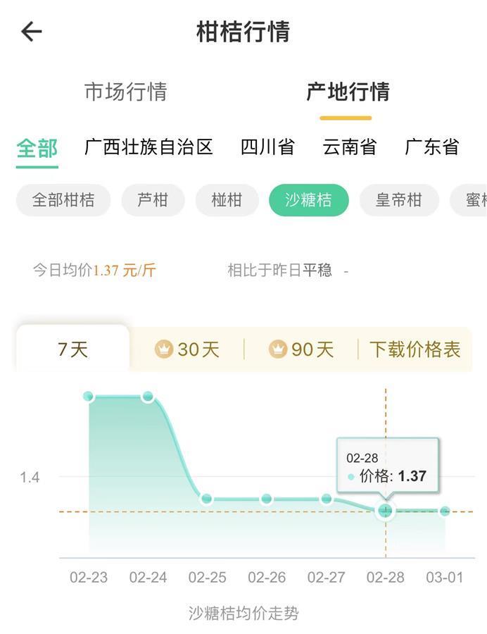 据农产品批发交易平台一亩田的行情数据显示,11月下旬开市以来,广西砂糖橘产地均价大部分维持在1-2元/斤左右,春节之前10天左右价格略有上涨,自2月份以来,价格持续下跌,最近一周价格在之间1.37-1.47元/斤之间,走货缓慢,有的地区甚至低至几毛钱,仍销售困难。