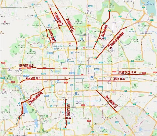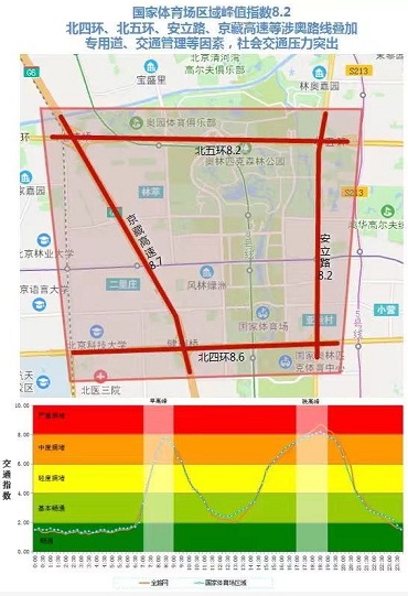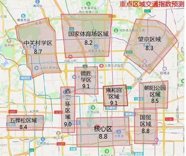 核心区、西二环、望京等常态拥堵区,德胜、中关村等主要学区,国贸CBD等主要商务区,以及国家体育场等涉奥重点保障区域路网高峰时段交通压力突出,部分道路局部路段持续拥堵。