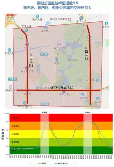 其中:东城、西城地处核心城区,交通压力最为突出,预计14点半以后进入中度拥堵级别,严重拥堵持续时间长达3小时,峰值交通指数8.9、9.1。