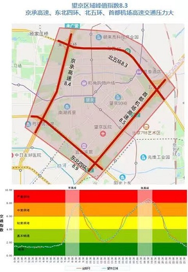 丰台、石景山总体交通压力水平略低、拥堵持续时间短,部分餐饮、娱乐周边区域车流集中,峰值交通指数8.1、8.2。