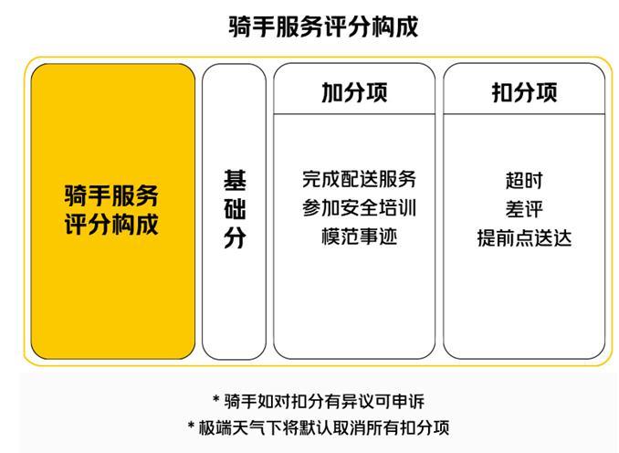 “服务星级”机制下,骑手每月的“服务星级”越高,单均奖励越多,星级根据骑手月度积分在本站点的排名确定。加分项包括安全培训、模范事迹等,针对差评、超时等情况的处理,则从原来合作商制定的扣款改为扣分。对于跑单时间较短的骑手,新机制还设置了一定次数的免扣分机会。“服务星级”一方面强化了对骑手的正向激励,引导骑手工作方式从单纯追求单量向追求综合服务质量转变,另一方面也改变以往合作商相对简单的管理方式,延长评价周期,让骑手在扣分后可通过加分项获得弥补,尽可能降低偶发状况对骑手收入造成的影响,降低骑手配送压力的同时,也有助于提升用户体验。