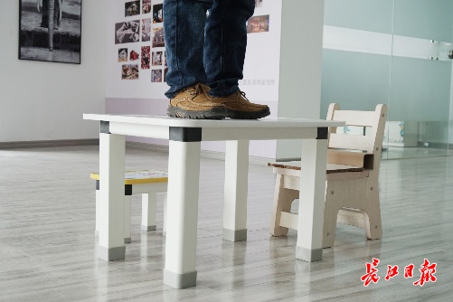 一张儿童纸桌子可以完全承受一个成年男性的重量。 长江日报见习记者秦璟 摄