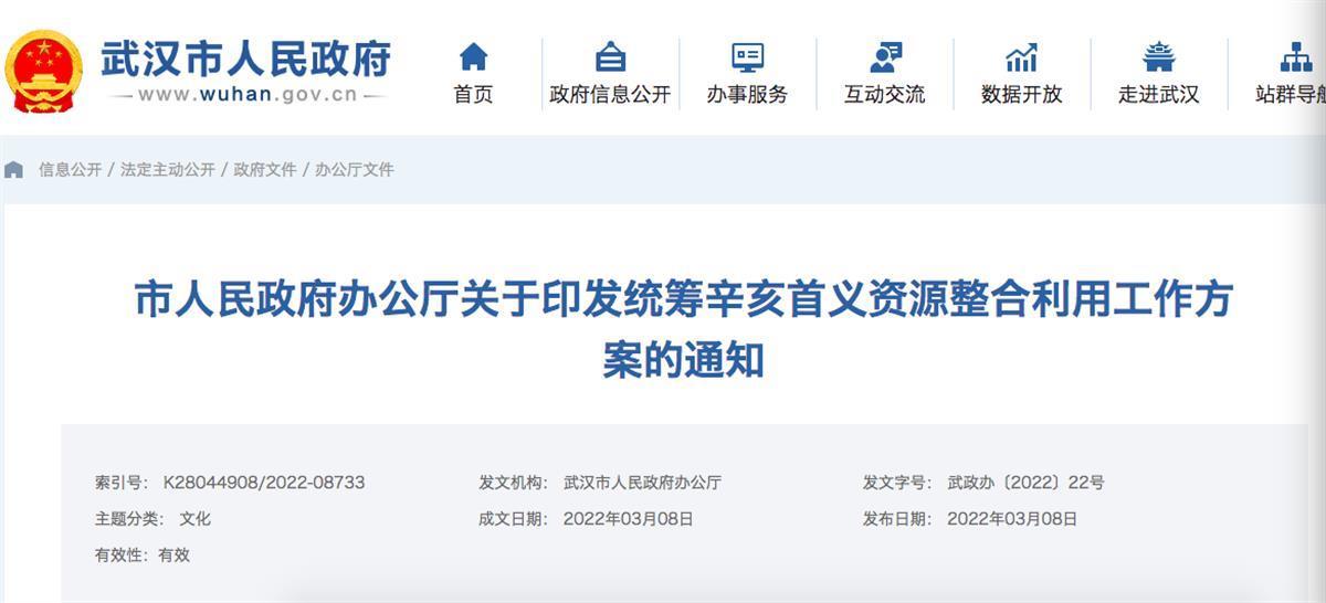湖北日报讯(记者严运涛)武汉市政府官网3月8日发布《统筹辛亥首义资源整合利用工作方案》,提出统筹整合利用好辛亥首义资源,打造具有国际影响力的辛亥首义文化品牌,把辛亥首义文化旅游区建设成为国际知名的辛亥革命文化展示区、国家级旅游休闲街区、国家级文化旅游消费集聚区和多功能资源综合开发利用示范区。